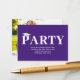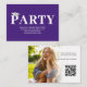 This design features a graduation QR code party invitation insert card, with a modern calligraphy minimalist template, a simple invitation insert, with purple and white school colours, and a graduation hat with calligraphy script typography photo lettering, with a social media Facebook icon for your party event page, and details info information details, a grad party information info details, graduate high school or college, party invitation insert card, with a scan scannable QR code details, a gradient gold and black lettering