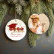 This keepsake ornament features red and gold cap and tassel on diamond shields with your graduating year, name and school on gold confetti background. Back features your favourite photo. Makes a great gift this holiday season. Easy to personalize with custom options.
