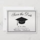 Announce your upcoming graduation in style and have your relatives and friends save the date with this elegant flat card. The design features a faux silver background with the words "Save the Date" in black script. A simple black graduation cap is in the centre and below is the date and your name to personalize. The back of the card has more info for you to customize as well. Designed by artist ©Susan Coffey.