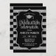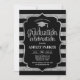 Graduation party invitation for men or women. Elegant invite card in black and silver. Modern simple design featuring stripes, a cap, faux glitter silver and typography script font. Perfect for a stylish graduation celebration.