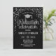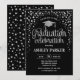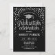 Graduation party invitation for men or women. Elegant invite card in black and silver. Modern simple design featuring faux glitter confetti, a cap and typography script font. Perfect for a stylish graduation celebration.