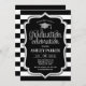 Graduation party invitation for men or women. Elegant invite card in black, white and silver. Modern simple design featuring stripes, a cap, faux glitter silver and typography script font. Perfect for a stylish graduation celebration.