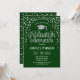 Graduation party invitation for men or women. Elegant invite card in green and silver. Modern simple design featuring faux glitter confetti, a cap and typography script font. Perfect for a stylish graduation celebration.