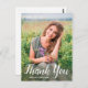 This custom photo graduation thank you postcard features a photo on the front with the word "Thank You" in white script with your name to personalize. Add a message of thanks on the back of the card and signature accented by a black graduation cap on white. Designed by artist ©Susan Coffey.