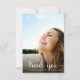 A modern graduation thank you card featuring the graduate's photo overlayed with "thank you" in a stylish white script with swashes and their name and class year in simple white typography. On the reverse side, add an additional photo, personalize a thank you message and add their name in a signature-like script.