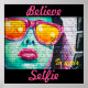 The Graffiti Believe in Your Selfie poster is a reminder to have confidence in yourself--believe in yourself. The poster also makes a great gift to encourage friends and loved ones to have self-confidence. The design features a graffiti painting (on a brick wall) of a woman wearing fuchsia sunglasses. Her skin is done in shades of turquoise. The text reads, "Believe in your Selfie" and can be customized as desired. Be sure to check out the matching shirt, scarf, compact mirror and more!