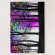 The graffiti-coloured sky is a riot of colour, with bright purples, blues, and yellows splashed everywhere. The black silhouette forest provides a stark contrast to the vibrant sky.