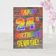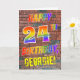 The front of this eye-catching, fun and exciting birthday-themed greeting card design features the message "HAPPY 24TH BIRTHDAY" with letters having a multicolored rainbow like gradient pattern, and a editable name coloured yellow, on a brick wall pattern background. The style is inspired by that of graffiti or street art drawn on wall. The inside features a customizable birthday greeting message. A fun, happy, customizable birthday greeting card like this might be given to celebrate somebody’s 24th birthday. [~Z0000357]