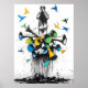This powerful graffiti-style artwork features a man covering his face, surrounded by an explosion of megaphones and vibrant birds flying away, symbolizing the chaos of media and the desire for freedom. The contrasting colours of blue, yellow, and green add depth and energy to this urban protest piece, making a bold statement about the impact of modern communication and personal expression. Ideal for those who appreciate street art with a deeper message, this design brings powerful symbolism and vibrant visuals to any space.