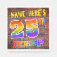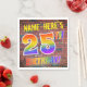 The front of this vibrant, exciting and eye-catching birthday-themed paper napkin design features a customizable name, and the message "25TH BIRTHDAY!" with letters having a multicolored rainbow spectrum inspired gradient pattern, on a brick wall inspired pattern background. The look is inspired by that of graffiti or street art drawn on a wall. Fun paper napkins like this might be used at a birthday party being held to commemorate somebody’s twenty fifth birthday. [~Z0000367]