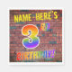The front of this exciting, vibrant and eye-catching birthday-themed paper napkin design features a customizable name, and the message "3RD BIRTHDAY!" with letters having a multicolored rainbow spectrum inspired gradient pattern, on a wall-of-bricks inspired pattern background. The appearance is inspired by that of street art or graffiti drawn on a wall. Fun paper napkins like this might be used at a birthday party being held to celebrate somebody’s third birthday. [~Z0000367]