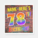 The front of this exciting, vibrant and eye-catching birthday-themed paper napkin design features a personalized name, and the message "78TH BIRTHDAY!" with letters having a multicolored rainbow spectrum inspired gradient pattern, on a wall-of-bricks inspired pattern background. The look is inspired by that of graffiti or street art drawn on a wall. Fun paper napkins like this might be used at a birthday party being held to celebrate somebody’s seventy eighth birthday. [~Z0000367]
