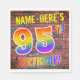 The front of this exciting, fun and vibrant birthday-themed paper napkin design features a customizable name, and the message "95TH BIRTHDAY!" with letters having a multicolored rainbow spectrum inspired gradient pattern, on a brick wall inspired pattern background. The style is inspired by that of street art or graffiti drawn on a wall. Fun paper napkins like this might be used at a birthday party for somebody who is celebrating their 95th birthday. [~Z0000367]