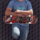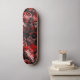 Skateboard with red and black graffiti plus skelton and words insane/power in design.