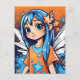 Cute postcard featuring a digital design of a cute orange and blue fairy girl with big blue eyes and long blue hair. She is surrounded by lots of blue and orange stars and blue splatters giving it a graffiti style look.