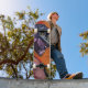 Graffiti art of a skateboarding guy, done with acrylic paint on city wall.