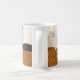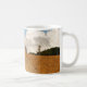 This fine art photography mug features a lovely rural farming landscape. It is Autumn and the grain harvest is underway. In the foreground gold, yellow and brown rows are partially cut. Peeking over the hill are the farm with its silos. Pure white cumulus clouds and a blue sky complete the composition.
