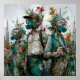 Masqué et résolu, un trio d'éco-activistes se dresse au milieu d'une floraison de fleurs sauvages et d'acier. Cette illustration grossière illustre l'esprit urgent de régénération et de rébellion dans un monde fragile.