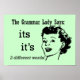 Grammar Lady dit : c'est et ce sont deux mots différents ! Grammar Lady veut que tu te rappelles que c'est "c'est" et que c'est possessif. Simple design couleur simple avec texte et visage.