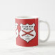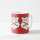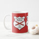 The Grammar Police are here! A funny coffee mug for the teacher or grammar nerd, showing 3 badge shaped white graphics with crossed red crayons and "Grammar Police to serve and correct" in black type. The background colour is customizable on the Edit menu.