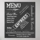 Grand menu de mariage de taille grande réalisé dans un look tableau noir gris charbon foncé. Le texte blanc fantaisiste avec différentes polices ajoute une touche décontractée et amusante à votre réception. Personnalisez le texte avec vos éléments de menu et ajoutez d'autres champs de texte en personnalisant ce superbe menu pour votre mariage.
