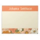 Ce grand bloc-notes, horizontal de 8,5 x 11, inspiré des années 70, lumineux et joyeux personnalisable, porte votre nom dans une police délicate et vintage sur un arrière - plan de pêche au melon avec garniture d'illustration super à motif orangé rétro. La zone d'écriture spacieuse est une couleur vanille lisse.
