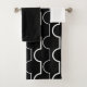Ce kit de serviettes est muni d'un linge blanc, d'une serviette de bain noire et d'une serviette de bain au design art déco de demi-cercles blancs, reliés par des lignes sur un champ de noir.