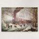 L'original et la lithographie intitulée American Railroad Scene - Snow Bound, montre des passagers et des membres d'équipage essayant de creuser un train enneigé dans les années 1800. Grand puzzle avec de nombreuses pièces.