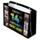 Cette conception joyeuse et attrayante de sac cadeau d'anniversaire a pour thème le message "HAPPY 14TH BIRTHDAY", avec le texte ayant un motif dégradé multicolore inspiré du spectre arc-en-ciel, avec un nom de destinataire personnalisable. À gauche et à droite du message à motif arc-en-ciel sur le devant se trouvent des photos qui peuvent être personnalisées, peut-être avec des photos du destinataire, de la famille et des amis du destinataire et/ou de l’expéditeur du cadeau. Un joyeux sac cadeau comme celui-ci pourrait être une façon amusante d'envelopper un cadeau d'anniversaire donné à quelqu'un qui célèbre son quatorzième anniversaire. (Photographie © Storytree Studios, Stanford, CA.) [~Z0000668]