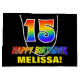 Ce modèle de sac cadeau d'anniversaire joyeux, amusant et coloré comporte un grand nombre de "15" et le message "HAPPY BANTHDAY", tous deux avec un dégradé de arc-en-ciel coloré inspiré couleur motif, ainsi qu'un nom de destinataire personnalisé jaune gras. L'arrière - plan est noir de couleur. Un sac cadeau amusant comme celui-ci peut être utilisé pour donner un cadeau ou un cadeau en l’honneur du 15e anniversaire de quelqu’un. [~Z0000477]