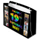 Cette conception joyeuse et joyeuse de sac cadeau d'anniversaire comporte le message "HAPPY 19TH BIRTHDAY", avec le texte ayant un motif dégradé multicolore inspiré du spectre arc-en-ciel, avec un nom de destinataire modifiable. À gauche et à droite du message à motif arc-en-ciel sur le devant se trouvent des photos qui peuvent être personnalisées, peut-être avec des photos du destinataire, de la famille et des amis du destinataire et/ou de l’expéditeur du cadeau. Un sac cadeau comme celui-ci peut être utilisé pour donner un cadeau ou un cadeau en l’honneur du dix-neuvième anniversaire de quelqu’un. (Photographie © Storytree Studios, Stanford, CA.) [~Z0000668]