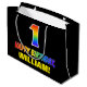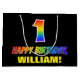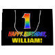 Ce modèle de sac cadeau d'anniversaire amusant, gai et coloré comporte un grand numéro "1" et le message "HAPPY BANTHDAY", tous deux avec une couleur motif inspirée du gradient de l'arc-en-ciel, ainsi qu'un nom de destinataire personnalisé jaune gras. L'arrière - plan est noir de couleur. Un sac cadeau d'anniversaire amusant comme celui-ci peut être utilisé pour envelopper un cadeau ou un cadeau donné à quelqu'un qui célèbre son 1er anniversaire. [~Z0000477]