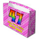 Ce design festif et optimisé de sac cadeau de 47ème anniversaire a un grand nombre de "47" ayant un motif inspiré par l'aspect d'un arc-en-ciel spectre. Il comporte également le message "Joyeux 47ème anniversaire", suivi d'un nom personnalisé. L'arrière - plan dispose d'un motif amusant de rayures rose pâle et rose foncé contenant des coeurs roses aimés. Des sacs-cadeaux comme celui-ci peuvent être utilisés pour envelopper des cadeaux ou des cadeaux donnés en l’honneur du quarante-septième anniversaire de quelqu’un. [~Z0000414]