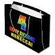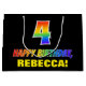 Ce sac cadeau d'anniversaire joyeux, amusant et coloré design comprend un grand nombre de "4" et le message "HAPPY BANTHDAY", tous deux colorés avec un motif inspiré par un gradient de spectre arc-en-ciel, ainsi qu'un nom de destinataire modifiable jaune gras. L'arrière - plan est noir de couleur. Un sac cadeau amusant comme celui-ci pourrait être utilisé pour envelopper des cadeaux donnés à quelqu'un pour célébrer leur quatrième anniversaire. [~Z0000477]
