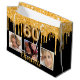 Un arrière - plan noir avec de faux gouttes de parties scintillant d'or, la peinture goutte à goutte. Personnalisez et ajoutez 3 photos et un nom. Le numéro 60 est écrit avec une police de style ballon. Parfait comme un sac de fête ou comme un sac cadeau.