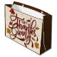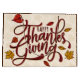 Une illustration numérique de "Joyeux Thanksgiving" dans un style festif et automnal. Les mots "Thanksgiving" sont affichés bien en vue dans une police cursive stylisée d'une couleur rouge profond et avec un effet tridimensionnel brillant, donnant aux lettres une apparence arrondie, presque semblable à des bonbons. Au-dessus de "Thanksgiving", le mot "Joyeux" est écrit dans une police sans-serif plus petite, également en rouge, et placé de manière centrale pour équilibrer la composition. Dispersées autour du texte, des illustrations de feuilles d'automne dans diverses nuances de rouge, d'orange et de jaune. Ces feuilles sont détaillées avec des veines et des textures visibles, ajoutant de la profondeur et du réalisme à l'illustration. Les feuilles sont placées de manière stratégique pour remplir les espaces vides et améliorer le thème festif global. Le fond est d'une couleur beige crémeux doux, orné d'un motif subtil de feuilles d'érable délimitées d'une teinte plus claire, offrant un arrière-plan doux et texturé qui ne détourne pas des éléments principaux. Le style global rappelle un design dessiné à la main, avec des lignes épurées et une palette de couleurs vives qui évoquent la chaleur et la joie de la saison de Thanksgiving. L'illustration est bien équilibrée, avec