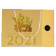 Design élégant avec papier doré coupé d'un Ox. Conception sur grand sac cadeau avec Large 2021, Année du x et monogramme sur noir rond + même image arrière - plan dans le dos. Vous pouvez facilement modifier le texte (police, couleur, taille et position) en cliquant sur le bouton personnaliser.
