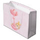 Un sac cadeau avec une adorable illustration d'un petit lapin brun portant une petite couronne dorée. Porté par des ballons dans une couverture de coeur rose.