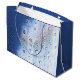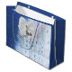 Grand sac cadeau brillant avec une image de verre bleu et blanc avec des gouttes d’eau suggérant des bulles d’air du respirateur d’un plongeur sous-marin dans une mer bleue profonde. Front a l'image d'un arc blanc en option et le charme de plongée argentée. Consultez la collection de sacs-cadeaux Under the Sea dans la section PARTY FAVORS.