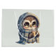 Sac cadeau avec kawaii illustration d'un hibou aux yeux grands en robe d'hiver et foulard tenant un café chaud.