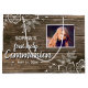 Illustration de la Première Sainte Communion moderne avec un arrière - plan en bois rustique avec des fleurs de dentelle décorative et des feuilles, script de calligraphie de typographie moderne. Il est facile de modifier l'image de l'échantillon du communicant avec votre propre image pour personnaliser le produit.