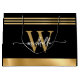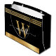 Sac de cadeau personnalisé élégant moderne et chic avec monogramme initial noir et or. Ce design présente un prénom dans une jolie calligraphie à queue avec monogramme initial en or et blanc avec une bordure rayée noire et or. Facile à personnaliser. Ce sac à cadeaux féminin est idéal pour un cadeau de crémaillère, ainsi que pour un anniversaire, un mariage, la fête des mères, une fête d'anniversaire pour les 16 ans, un enterrement de vie de jeune fille, une baby shower, un cadeau pour une fête de fin d'études et il est destiné à la fille qui aime les choses uniques et tendance.