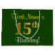 Grand Sac Cadeau Elégant, Vert, Faux Or 15ème anniversaire + Nom