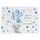 Un art de baby shower mignon avec un petit éléphant garçon aux oreilles bleues tenant des ballons aux couleurs bleu, blanc et argent. Conception de baby shower adorable avec étoiles bleues et crème autour. Personnalisez en changeant le texte et les détails.
