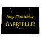 Un côté de cette conception amusante et simple de sac cadeau d'anniversaire a un grand numéro "23" avec un motif rose foncé et rose clair rayures. L'autre côté a le message de voeux d'anniversaire "Joyeux 23ème anniversaire", et un nom modifiable, tous les deux en texte jaune. L'arrière - plan a une coloration noire. Un sac cadeau comme celui-ci peut être utilisé pour envelopper des cadeaux ou des cadeaux donnés pour célébrer le vingt-troisième anniversaire de quelqu’un. [~Z0000378]