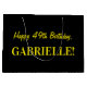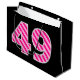 Un des côtés de ce design amusant et simple de giftbag à thème anniversaire a un grand nombre "49" avec un motif rose foncé et rose clair rayures. L'autre côté présente le message de voeux d'anniversaire "Joyeux 49ème anniversaire" et un nom modifiable, tous deux en texte jaune. L'arrière - plan a une coloration noire. Des sacs-cadeaux comme celui-ci peuvent être utilisés pour envelopper des cadeaux ou des cadeaux donnés pour célébrer le quarante-neuvième anniversaire de quelqu’un. [~Z0000378]
