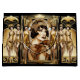Une belle brune Flapper girl porte un faux haut et un bandeau doré qui semblent scintiller et briller contre un arrière - plan noir. Elle porte un eyeliner noir épais et un rouge à lèvres foncé qui fait apparaître sa peau de porcelaine rayonnant dans la lumière et est encadré d'un cadre rétro, style art déco orné faux or cadre. Elle est accompagnée de trois danseuses de flapper glamour dans des robes en or satiné époustouflantes. Ils sont en train de monter sur une scène sur le point de danser toute la nuit. Ce design est idéal pour un "grand gatsby", "années folles", 1920 Flapper fille thème anniversaire, douche nuptiale, mariage ou anniversaire. Il est idéal pour les projets de découpage et de scrapbooking.