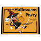 Illustration d'un sac de la fête d'Halloween, avec une sorcière de dessin animé portant un bâton de brosse. Elle est habillée d'un casquette de sorcière noire avec des rayures rouges, une robe noire et des chaussettes rayées rouges et blanches. Elle tient une lueur jack-o'lanterne dans une main. L'arrière - plan est orange avec le mot "Halloween".