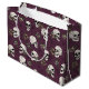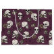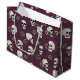 Dessiné à la main dans l'encre noire, ce sac cadeau présente un beau motif de crânes, de roses et de toiles d'araignée dans des tons crème et rougis, le tout contre un élégant arrière - plan violet de marron foncé.