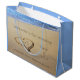 Un sac de bienvenue pour un mariage à la plage, avec les initiales de la mariée et du marié écrites à l'intérieur d'un coeur dans le sable, sur la plage. Sur la bordure supérieure nous voyons un océan bleu Le texte est marron, comme le coeur de sable. La photo de la plage avec le coeur de sable est de Petr Kratochvil de Public Domain Pictures et elle est gratuite pour un usage commercial. Les côtés latéraux du sac sont bleu clair, comme l'océan et le ciel.
